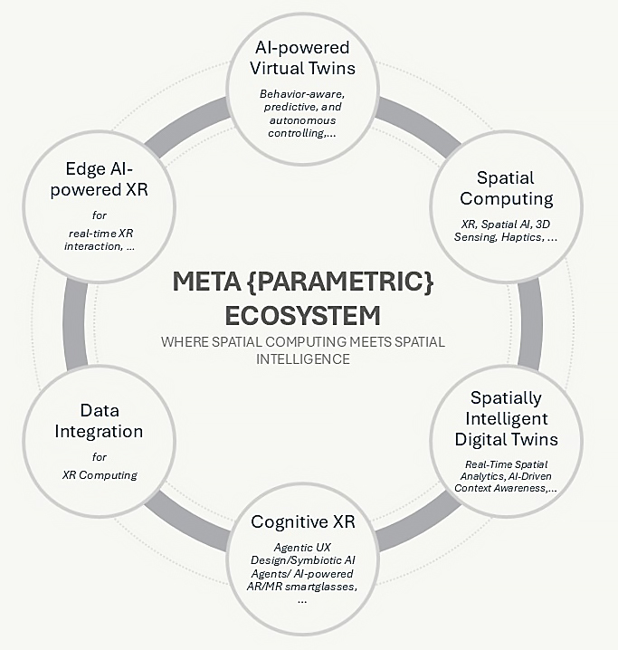 The Meta{Parametric} Ecosystem represents a visionary framework for designing intelligent, immersive, and adaptive spatial experiences. At its core is the convergence of AI, XR, spatial computing, and real-time data integration—enabling environments that are not only visualized but sensed, interpreted, and co-created. From AI-powered virtual twins and cognitive XR to edge-based interaction and symbiotic AI agents, each component contributes to a seamless, multimodal interface between humans and their digitally-augmented surroundings. This ecosystem defines a new paradigm for architectural intelligence, where Intelligent Spatial Design becomes a dialogue between data, machines, and human cognition.