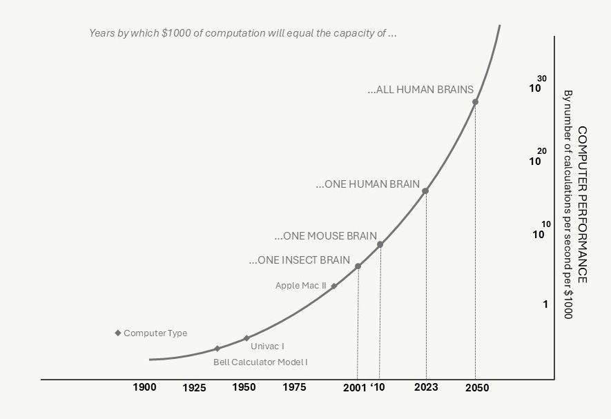 The exponential trajectory of such innovations is elegantly illustrated by Ray Kurzweil through what is now known as the Kurzweil Curve. This framework, derived from his work in The Singularity Is Near (2005), predicts accelerating returns in technological development, especially in computing power, AI, and biotechnology. Kurzweil argues: