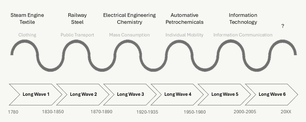 This wave-based model of technological change finds resonance in the economic theory of Kondratiev Waves, introduced by Russian economist Nikolai Kondratiev in the 1920s. Kondratiev proposed that modern capitalist economies experience long-term cycles of boom and bust, typically spanning 40 to 60 years, driven by clusters of technological innovations. Each wave has been accompanied by a new technological paradigm: steam engines, railways, electricity, mass production, and now digital and AI technologies.